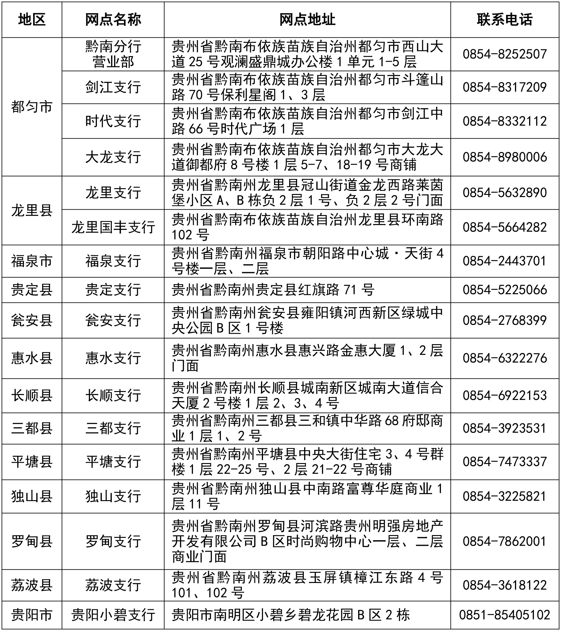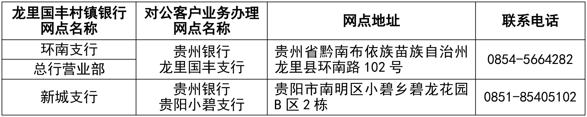 自2026年1月12日起,龙里国丰村镇银行个人客户可到以下任一贵州银行网点办理业务,贵州银行将提供凭证更换等后续服务。